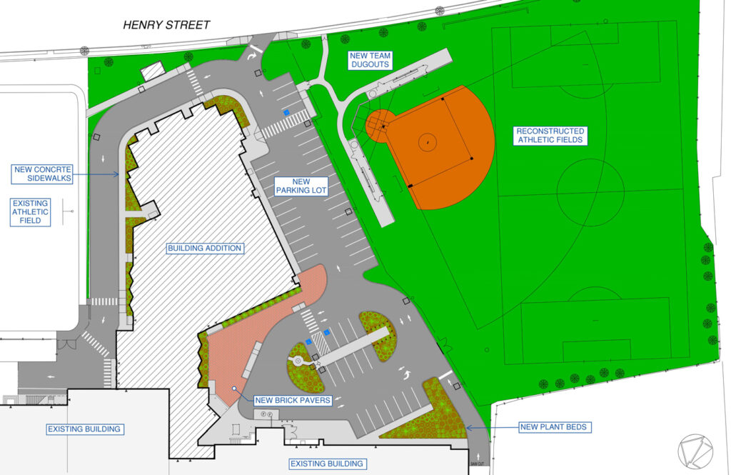 The project addresses long-standing overcrowding that led to the wide-spread use of portable classrooms. The expansion includes a two-story academic wing with flexible classrooms, a modern cafeteria, a library and media center, and athletic facilities including soccer and baseball fields and a running track. Re-designed parking areas and updated security systems are also part of the school improvement plan.
